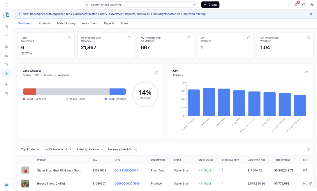 We combine advanced elasticity science with constrained optimization so your business rules (margin floors, KVIs, CPI, step rules) are always honored. Plus, our platform has competitive intelligence data, giving you real-time visibility into your market – something most vendors can’t match.